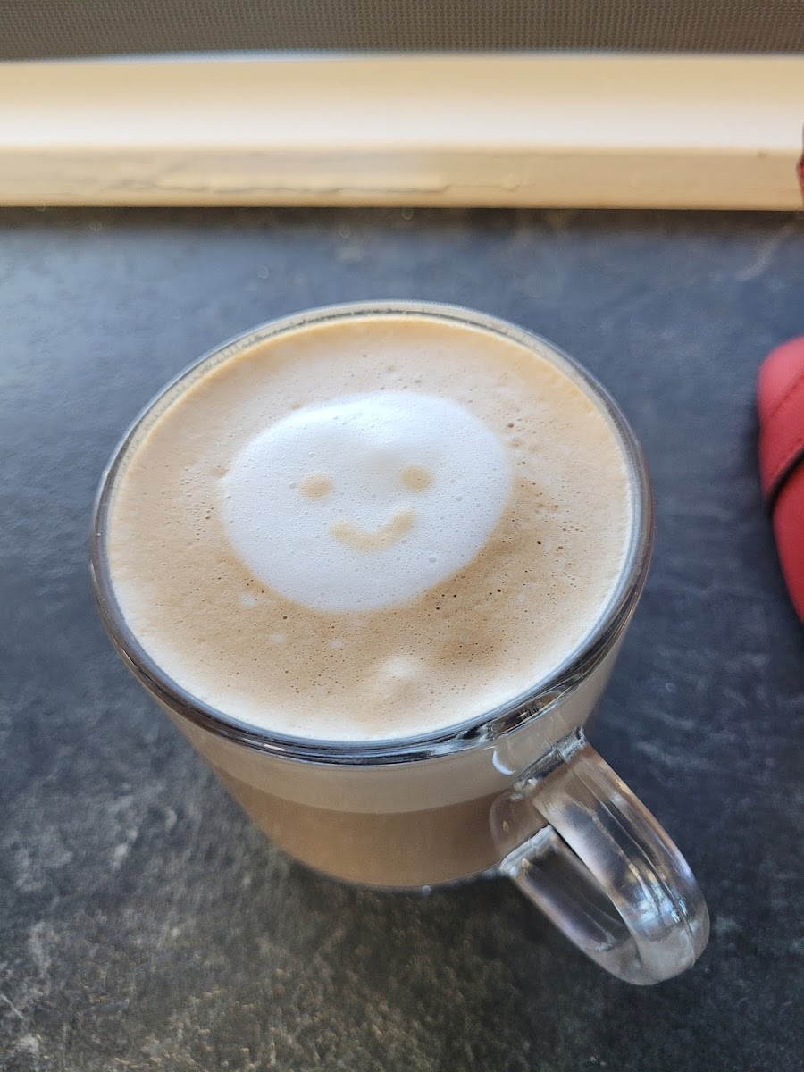 Great! It was my first time there. Jo (one of the owners) took the time to answer any questions I had regarding substitutions on food. I ordered the big breakfast but subbed regular pancakes for the apple fritter pancakes, which are a must. I ordered a purple haze latte. Little did I know, as she turned around and drew the little character you see on the cup in the photo, that I went to find a table. While I was seated, several servers and her brother Jackson (the other owner) came by to check and see if I needed anything. The restaurant is small, perfect for one or two people to come in and grab a quick bite. Their menu is pretty extensive for breakfast and lunch. You can find something for everyone. They also have coffees and smoothies, not to mention a drive-through for quick grab-and-go items. They had several bakery items such as flavored scones, cookies, and salted caramel bars. I definitely will be back.